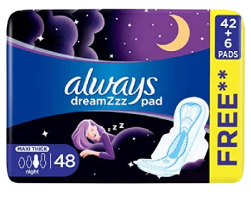 Always Dreamzz pad Clean & Dry Maxi Thick, Night long sanitary pads with wings, 48ct